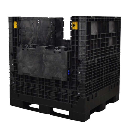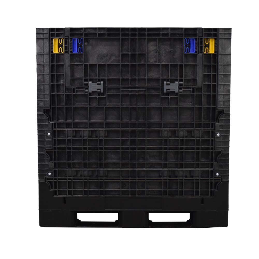 The Buckhorn 45" x 48" x 51" solid bottom, extended-height collapsible bulk container is a heavy-duty container ideal for a variety of applications. made from high-density polyethylene, the 45" x 48" footprint, 51" height collapsible bin can hold up to 2,000 lbs. per load. Its extended height makes handling, storing, and transporting tall and hard-to-fit components easy within a 45 x 48 footprint. The container is made with two drop doors, equipped with articulating hinges, that make it simple to access its contents. This container is stackable both upright and collapsed.